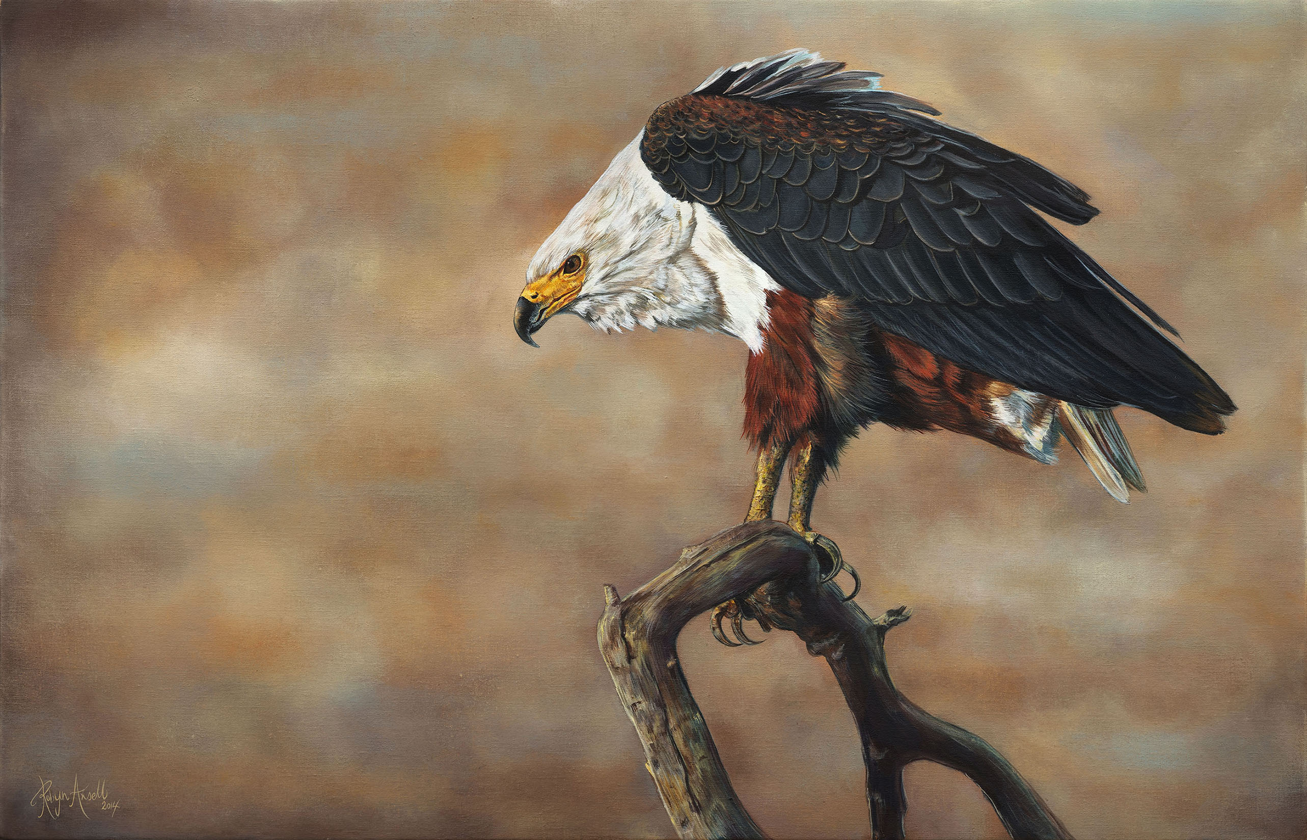This is such a special and unique image from Chris Martin Wildlife Photography, I just love the intensity captured in this image through both posture and light composition. The stance is refreshingly different from the typical images one usually sees of fish eagles in flight. Chris’s original image has a dark green background, I have painted a version using the original colouration and I have always loved the way the eagle stands out in front of a dark background. This particular piece was done as a commission in 2014 and I must say that the lighter background has its own charm and character. Background aside, the original image is in my opinion a beautiful representation of an African icon and it was a privilege to paint it.