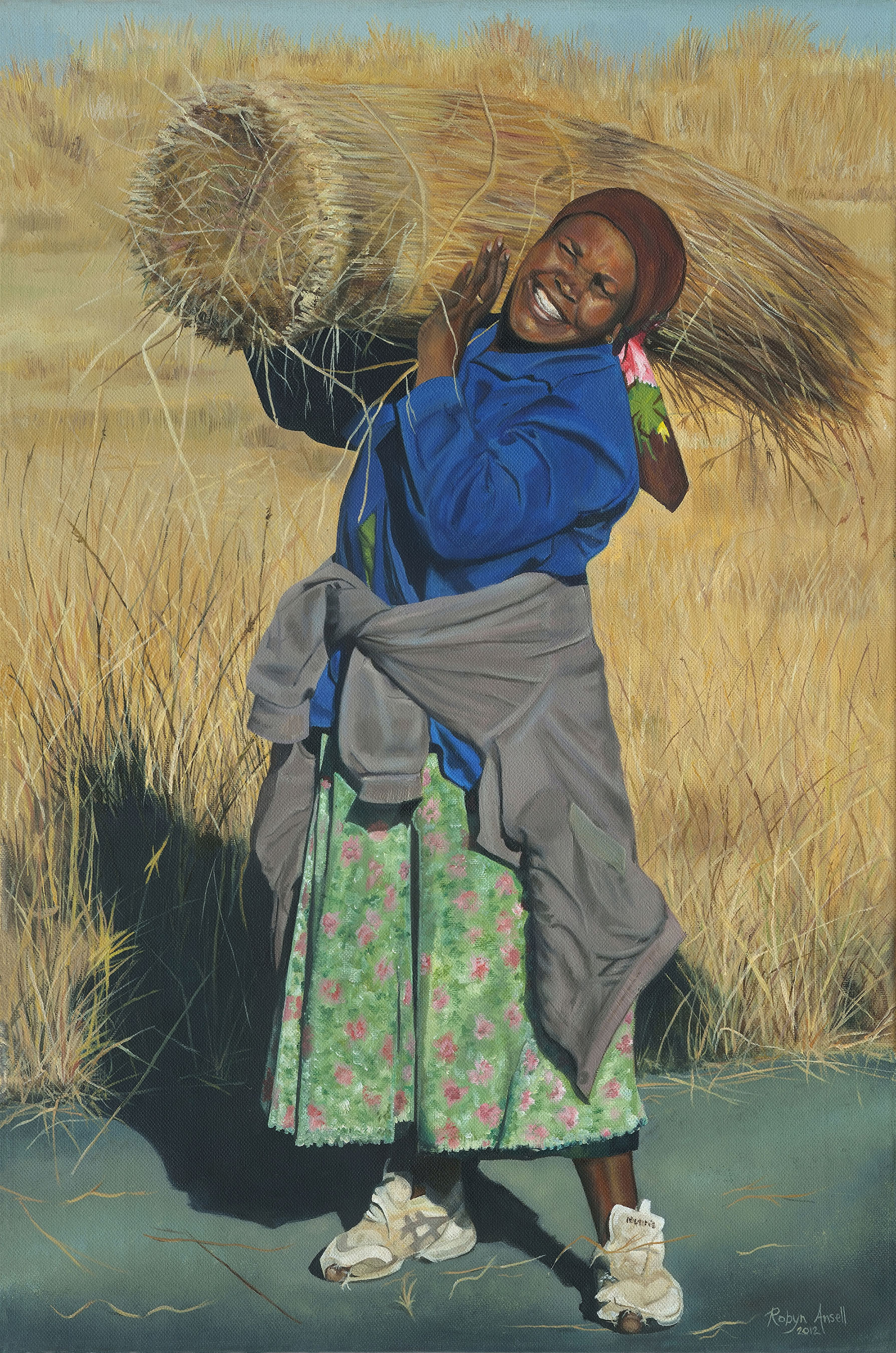 The typical miss-matched items of clothing (and the colour and texture of each) bring such originality and character to the work. The holes in her shoes which reveal the big toe on each foot always get a mention when people view this work- I had such fun attempting to capture the detail of the fraying fabric. The bundle of giant thatching grass hoisted so proudly over her shoulder is so typical to the Ladysmith area and wash such a joy to recreate in oils with its rich, warm colours and texture.