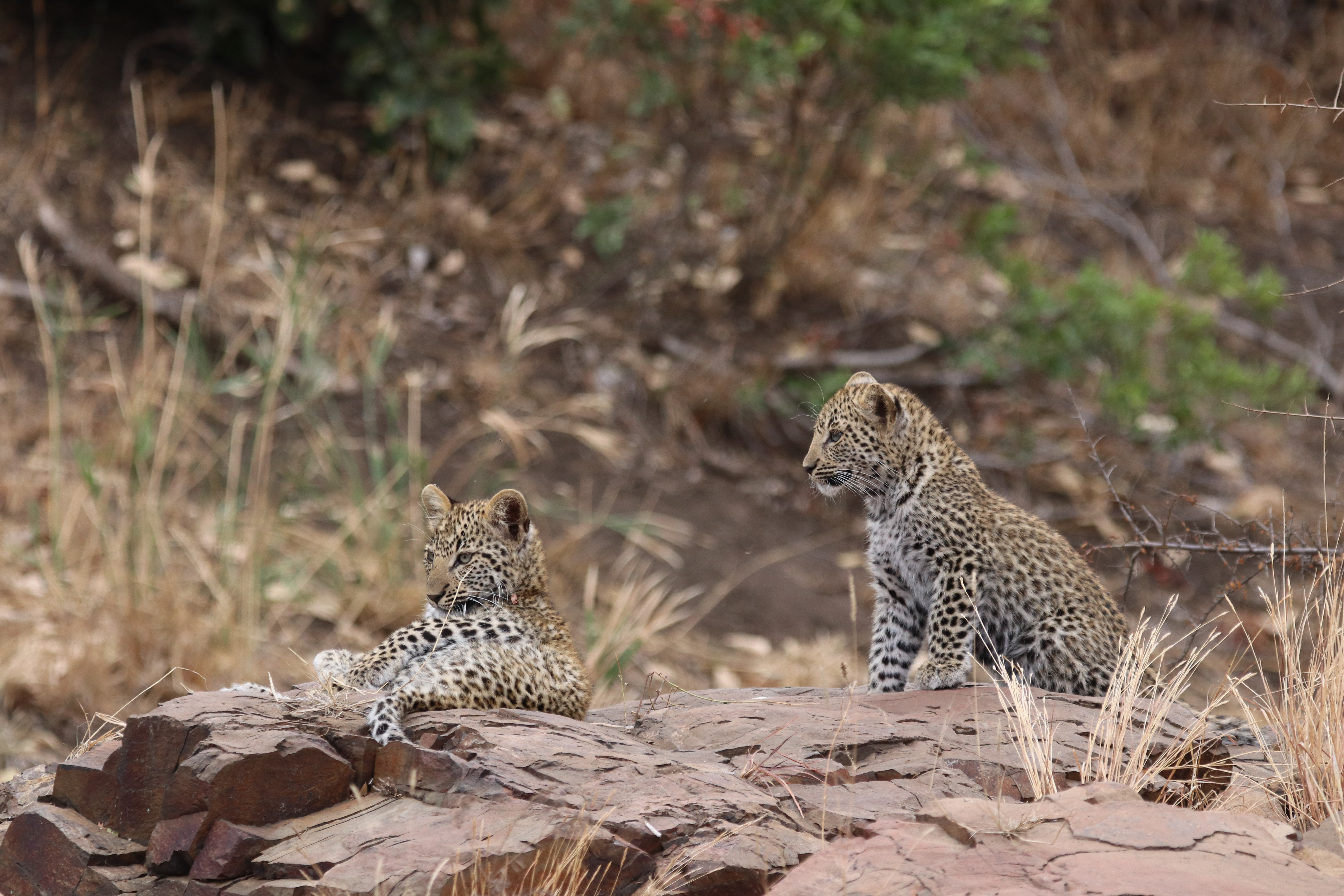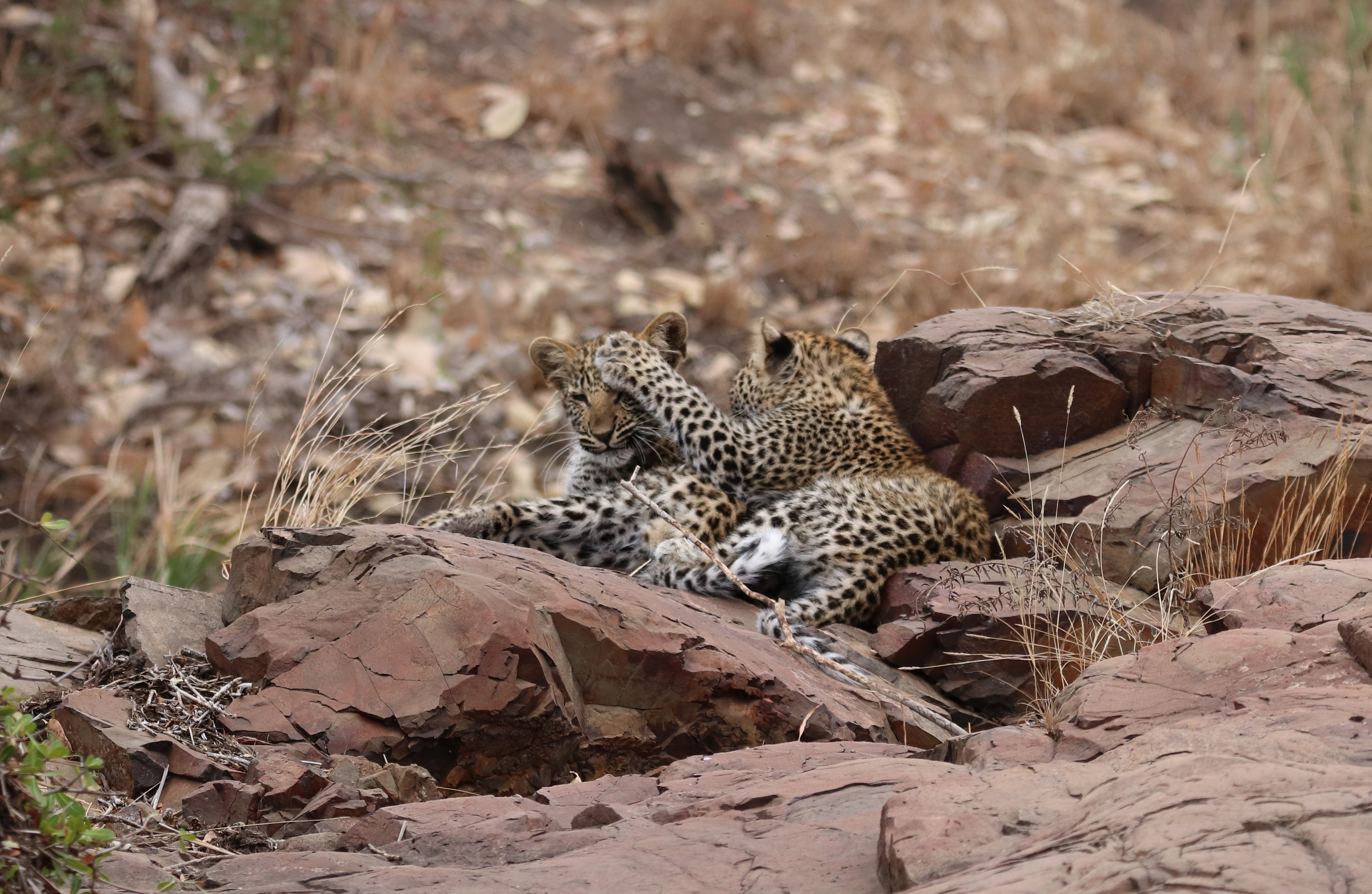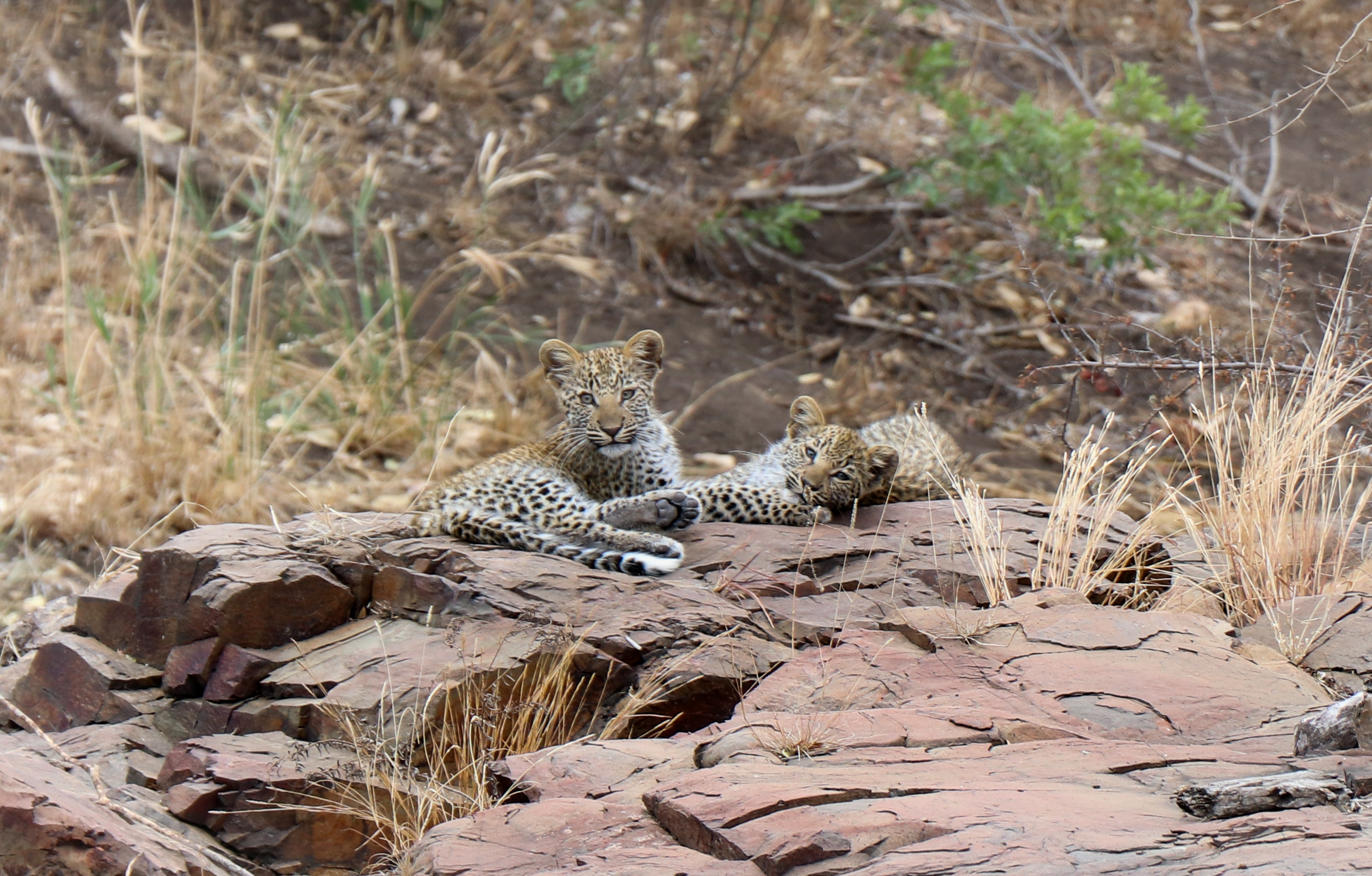 Can you believe it! Right there in front of us. Lounging on the rocks, in full view . Two gorgeous, immaculate, PERFECT little leopard cubs. At this point, I’m completely blown away by the urgency in which Kruger has delivered my sightings request. It then dawns on me that I haven’t yet attached the ‘big’ lens to my camera… Anyway, it didn’t even matter because the cubs were not perturbed by our presence in the slightest. They made no attempt to hide away. I snapped a few pics with my the smaller lens whilst Nic located the larger lens for me. I tired to attach it but my shaky adrenaline fingers would not quite co-operate. Trusty Nic took over, attaching the lens in record time. I had not used the camera before (apart from a few halfhearted snaps of a noisy rock thrush in the garden at home). It was all a bit chaotic from a photographic point of view, but my goodness, what an incredible sighting .