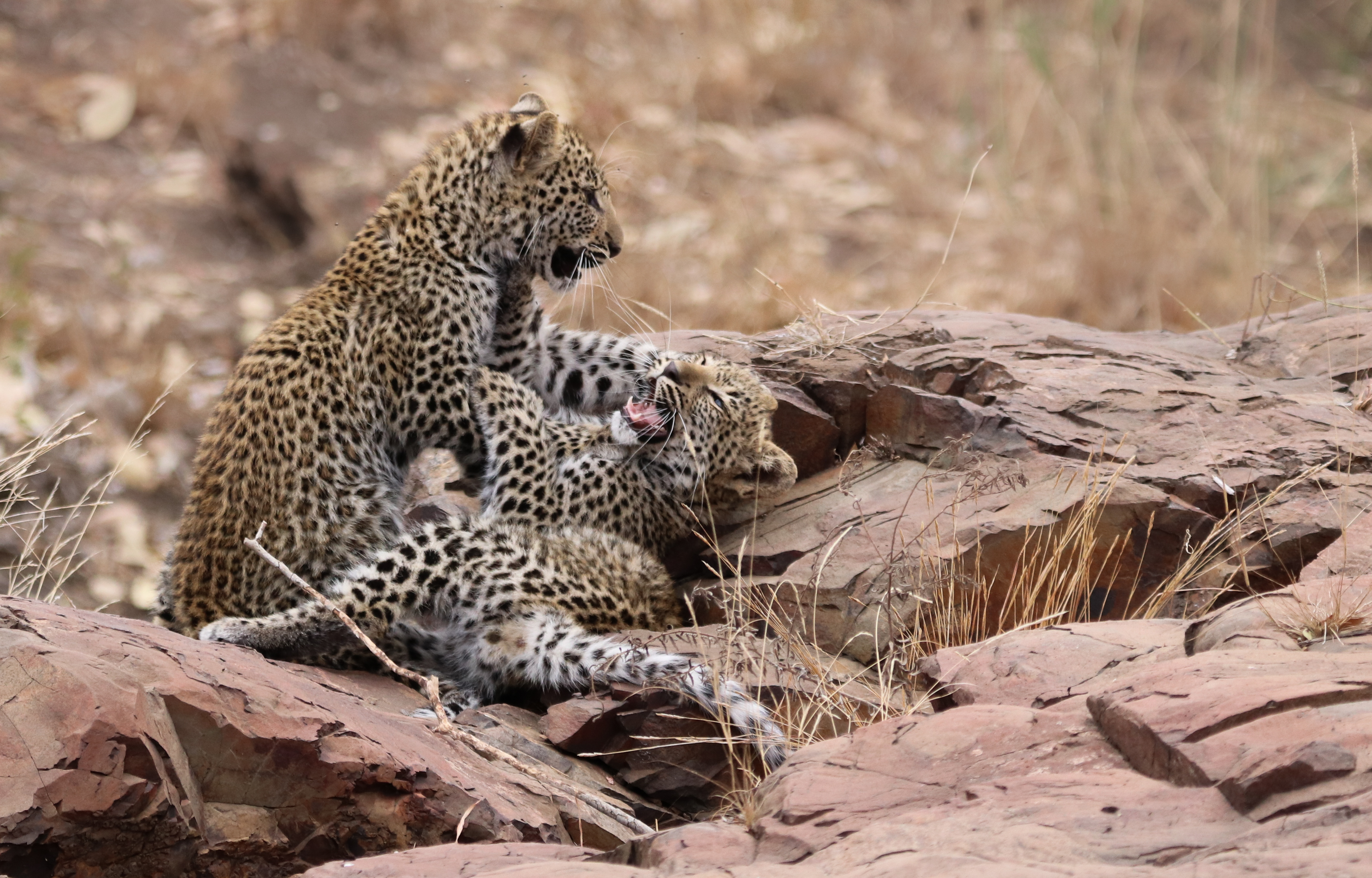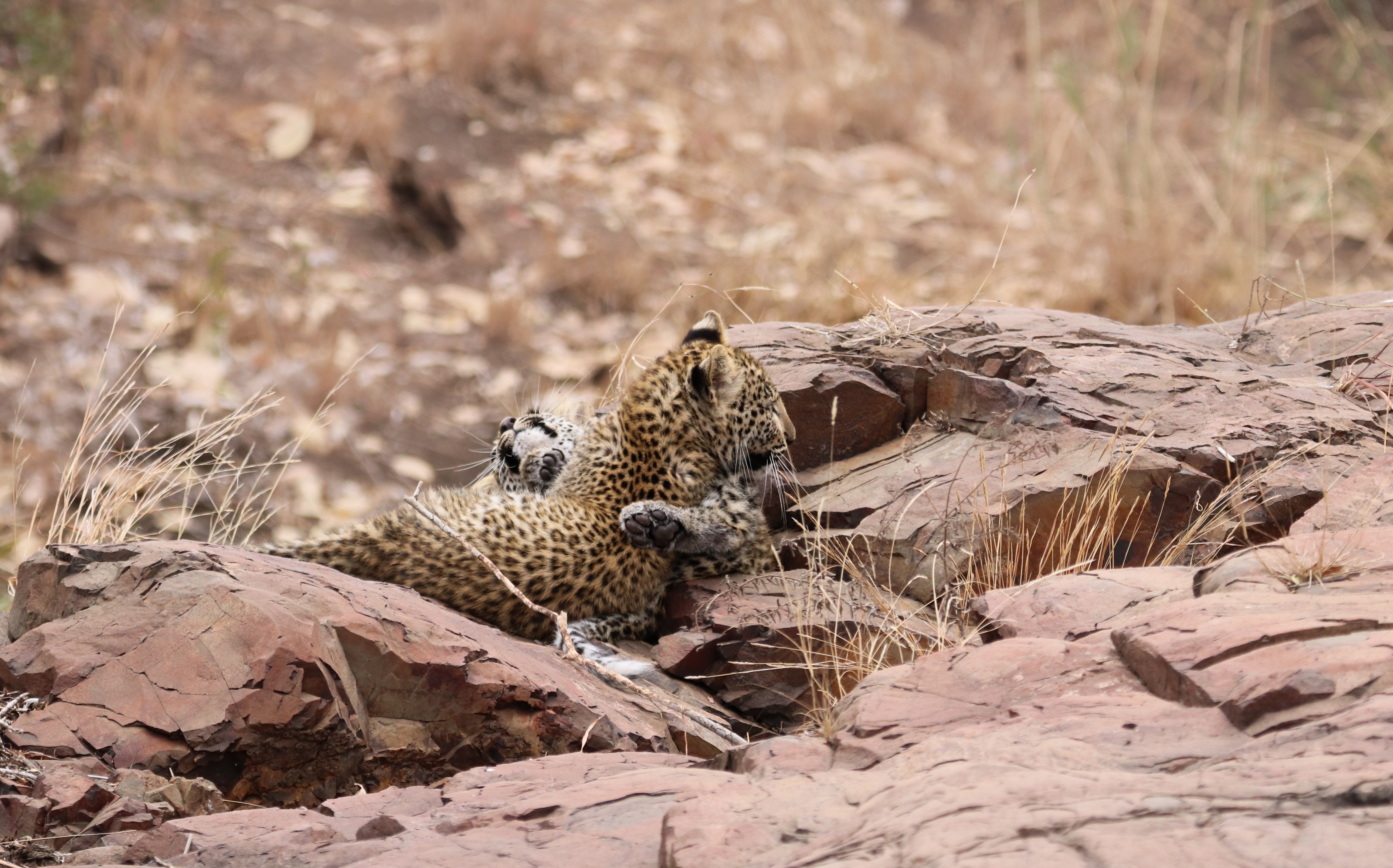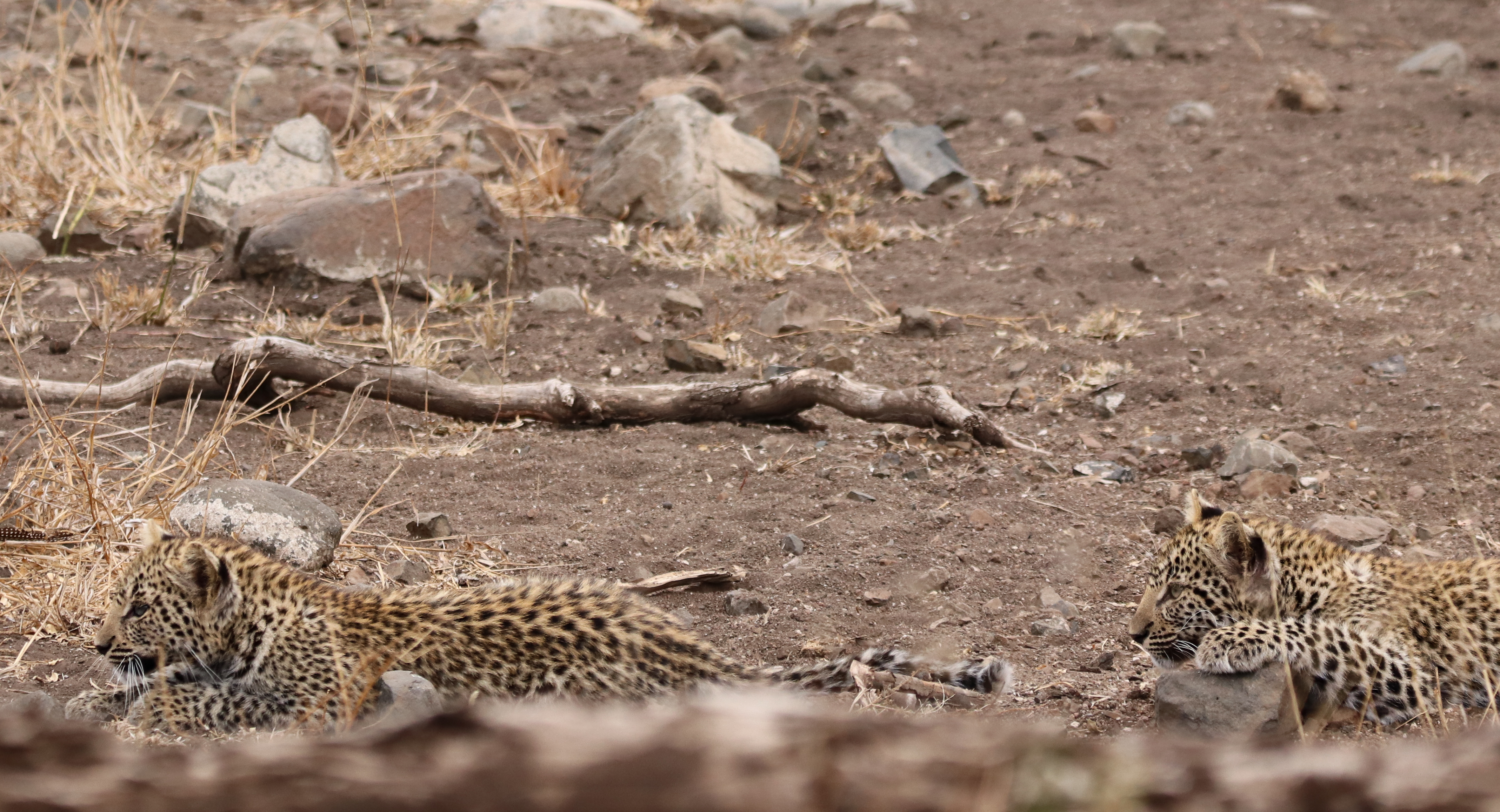 Eventually, she rose to her feet. She gave a lazy stretch before subjecting her brother to her ‘sleepy pounce’ routine. The ‘sleepy pounce’ – it’s a movement that starts with all the promise of a full blown pounce. Half way through the pounce however, the pouncer realizes that they’re still quite sleepy. The pounce is subsequently aborted once liftoff has ensued. This results in a rather messy and definitely awkward, halfhearted collision with the victim. Once contact has been established, the pouncer remembers that she’s wanting to wake up to play, not to sleep. The body then engages ‘wake-up stretch’ mode. The stretch is executed whilst draped atop the head of the victim. The stretch is finished off with a biiiiiiiig toothy yawn. It is evident that this tactic is most confounding to the victim. It’s a well known fact that yawns are contagious and, in a moment of confusion the victim can’t recall if he is feeling sleepy or playful himself. The conclusion is irrelevant as the last act of the sleepy pounce is performed. Both pouncer and victim slide head first off the small, smooth and evidently slippery river rock on which they are lying. Heads are in the sand, bottoms are in the air, tails are tangled and there is a furry blur of spots all over the place. It’s all just very bewildering. It’s also very amusing to any onlooker who happens witness the performance!!!! Oh, but good luck trying to photograph the sequence with adequate sufficiency. The sleepy pounce routine has an effect on spectators too. You find yourself laughing hysterically, instead of clicking away with your camera. But that’s okay.